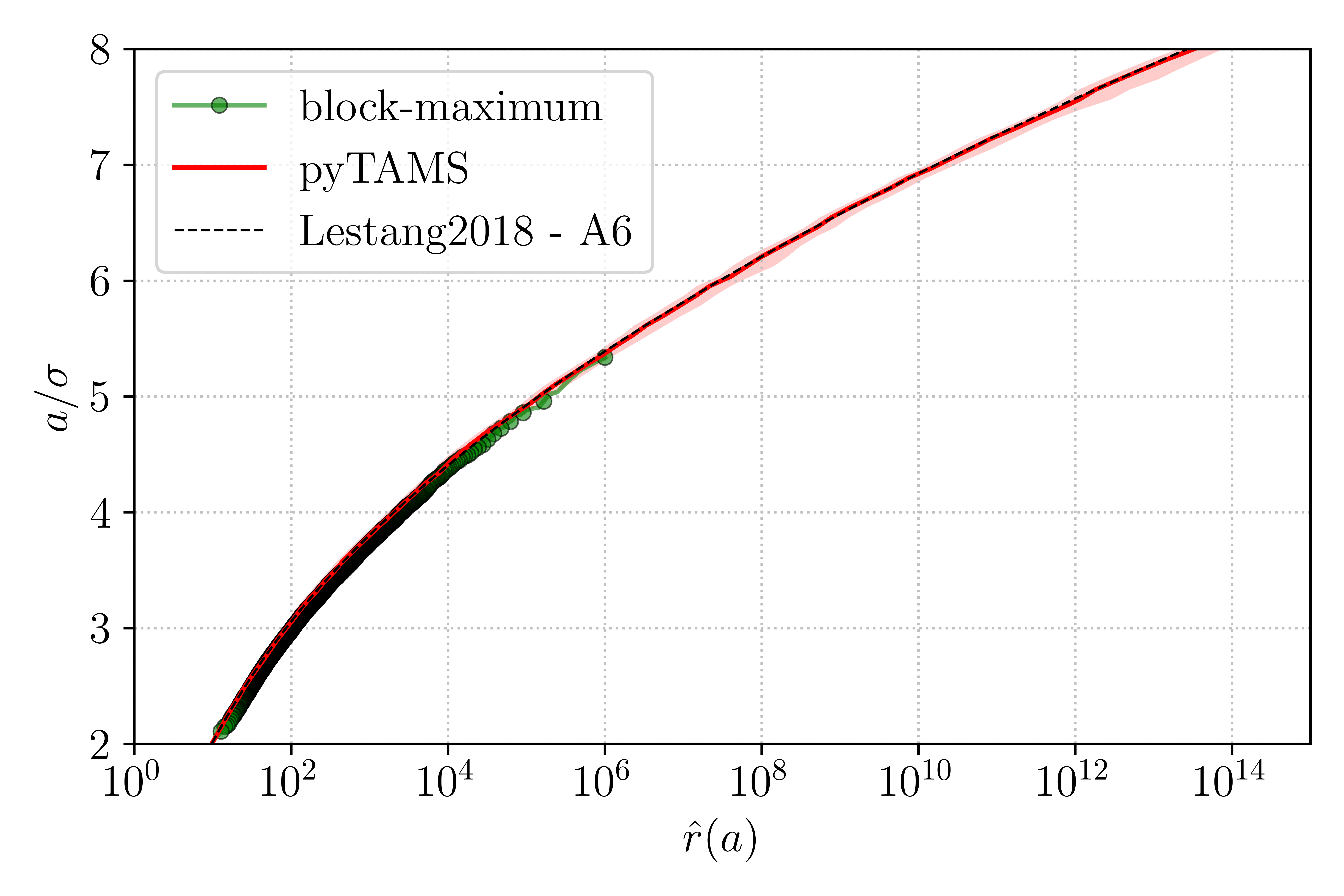 Figure 5 : Comparison of return times \(\hat{r}(a)\) of an OU process obtained with the block-maximum method, TAMS and the theoretical expression of Lestang et al.¶